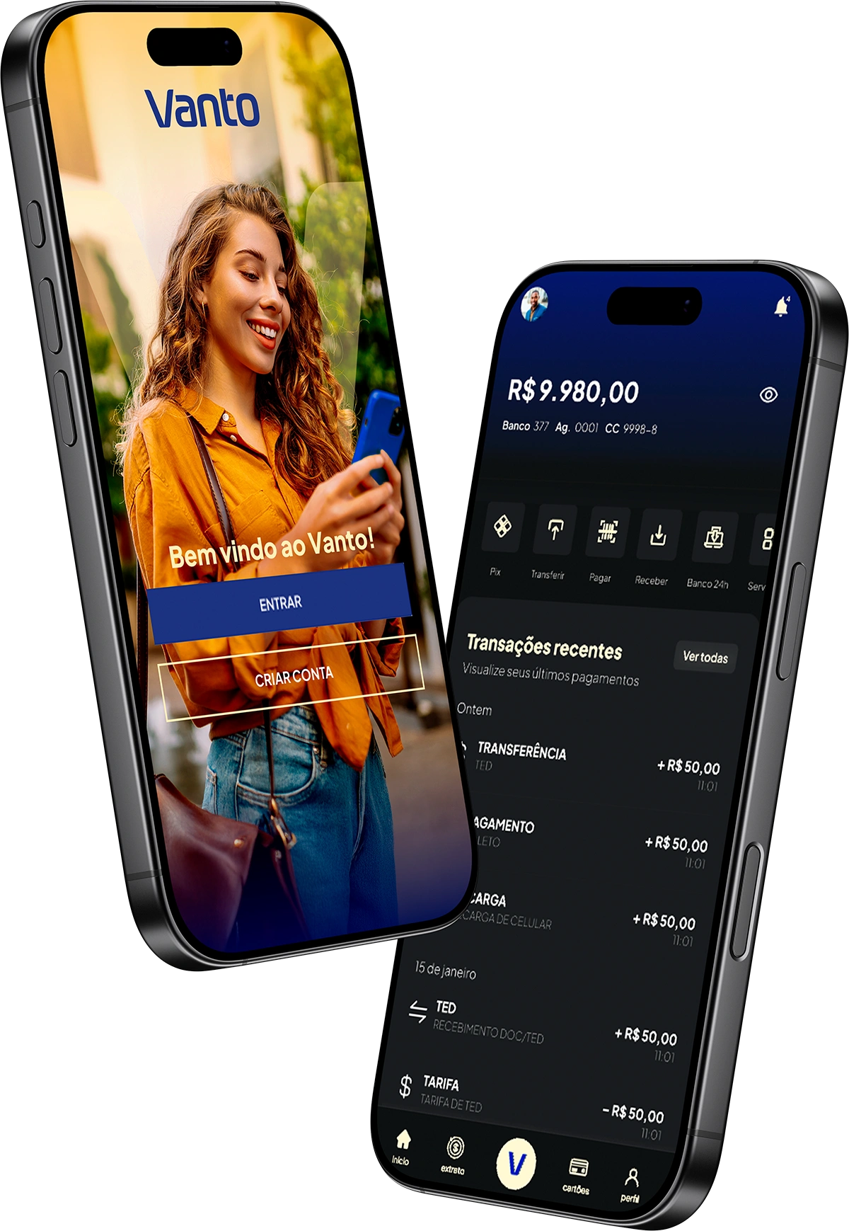 A conta digital Vanto foi criada para oferecer mais praticidade e controle sobre seu dinheiro. Com ela, você pode realizar transferências, pagar contas, fazer recargas de celular e gerenciar seu saldo de forma simples e rápida, tudo pelo nosso app. Esqueça as burocracias dos bancos tradicionais e tenha uma conta moderna, segura e sem tarifas abusivas.